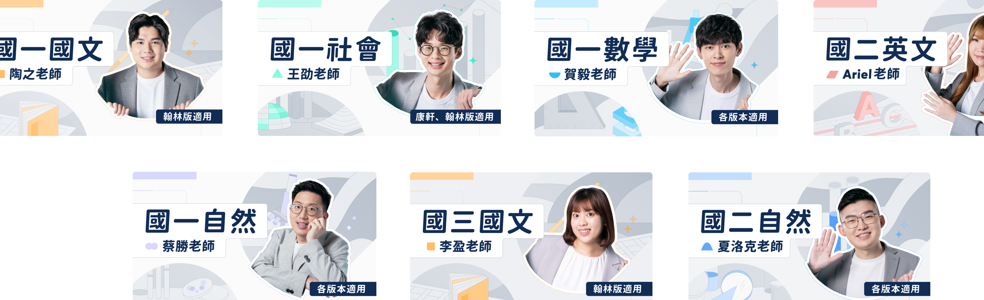 The course thumbnails are designed for the course page, clearly indicating the subject, grade level, and tutor. They help students quickly identify and select courses while maintaining visual consistency across the platform.